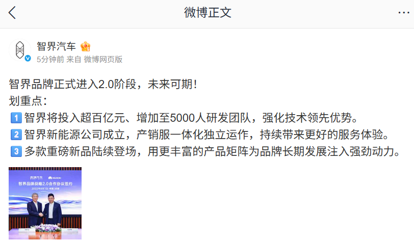 据介绍,智界将投入超百亿元、增加至 5000 人研发团队,强化技术领先优势;智界新能源公司成立,产销服一体化独立运作;多款重磅新品陆续登场,用更丰富的产品矩阵为品牌长期发展注入强劲动力。